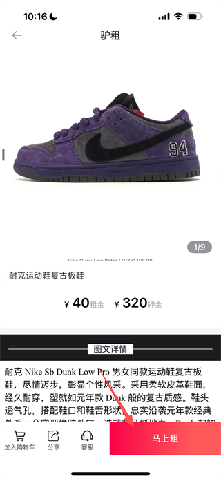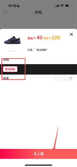 3、在商品详情页,点击马上租按钮,进入规格选择弹窗。