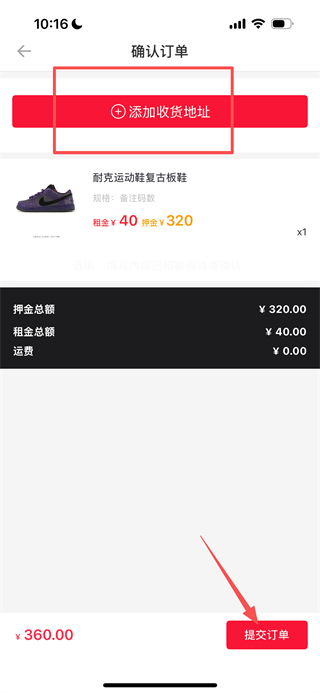 5、在订单页面,添加收货地址后点击提交订单,完成租赁下单。