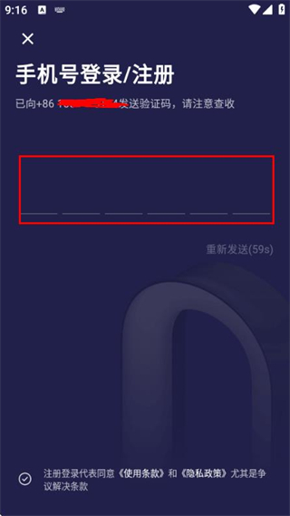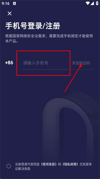 3、在登录页面填写手机号,勾选协议后,点击获取验证码。