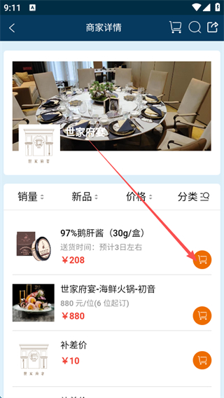 1、在泛海e生活首页点击展示的世家·府宴区域,进入对应的商家页面。