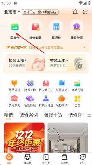 1、在该装修APP首页点击看案例选项,进入看案例页面。