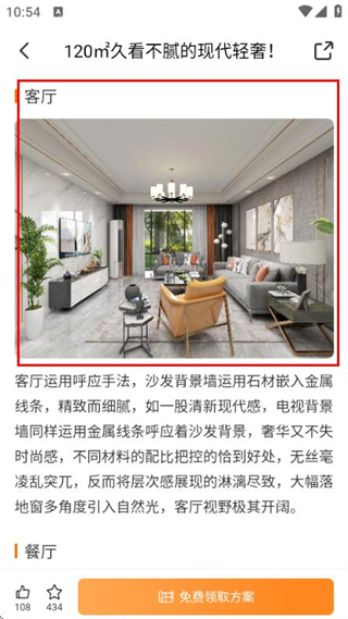 3、在案例详情页面查看房间区域的装修效果图,及对应的文字介绍内容。