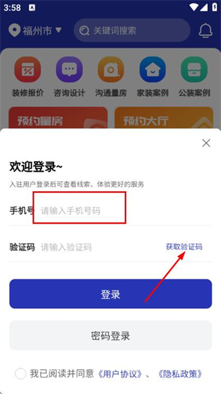 2、在手机验证登录页面填写手机号,勾选协议后,点击获取验证码。