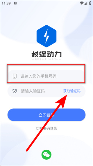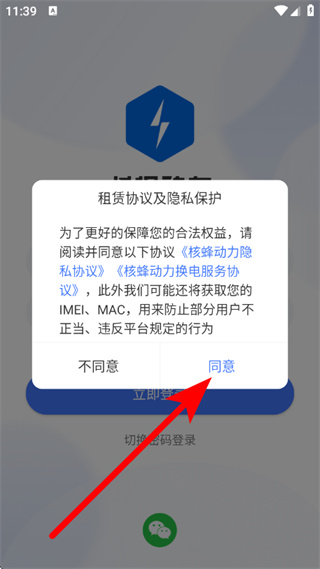 1、打开核蜂动力,在租赁协议弹窗中,点击同意,进入登录界面。
