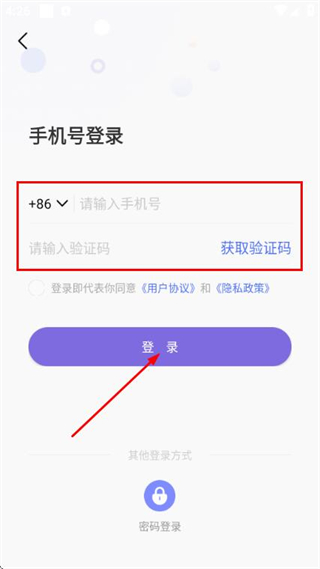 3、在登录页面填写手机号和验证码,勾选协议后,点击登录完成账号登录操作。