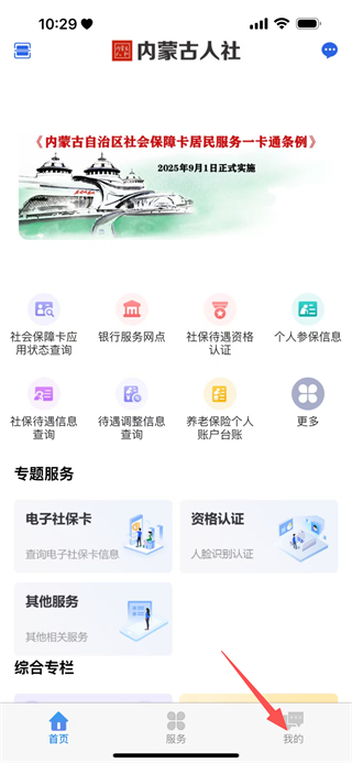 1、在内蒙古人社首页,点击底部导航栏的我的,进入个人页面。