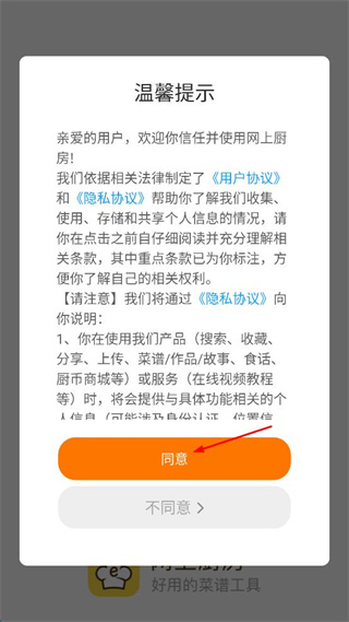 1、在软件弹出的温馨提示界面,点击橙色的同意按钮,进入主界面。