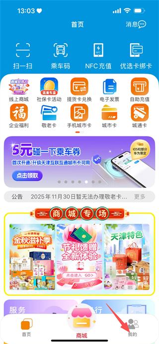 1、在天津一卡通首页,点击底部导航栏的我的,进入个人页面。