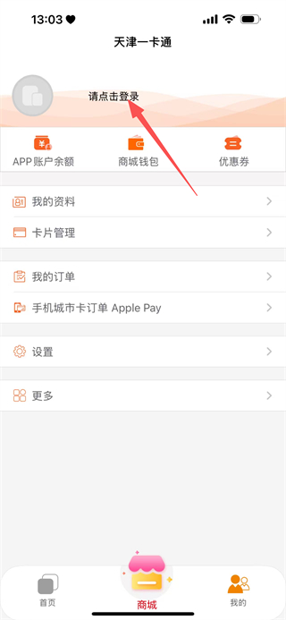 2、在个人页面,点击请点击登录区域,进入天津一卡通登录页面。