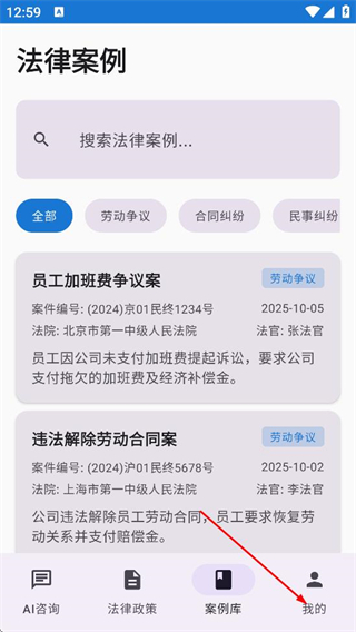 1、在法律案例页面,点击底部导航栏的我的,进入个人页面。