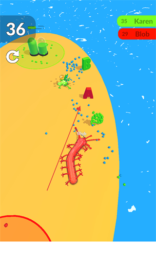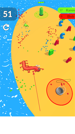 2、持续收集场景中的小颗粒,让史莱姆不断变长变大。