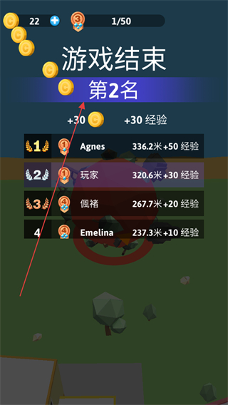 4、游戏结束后显示排名,获得30金币与经验,可准备下一局挑战。