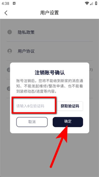 4、在注销账号确认弹窗中,输入验证码后,点击确定,完成注销。