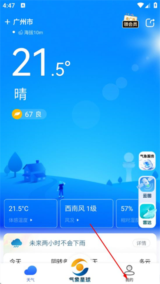 1、在看天气应用首页,点击底部导航栏的我的,进入个人页面。