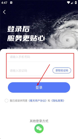 3、在登录页面,填写手机号、获取并输入验证码,点击登录,完成账号登录。