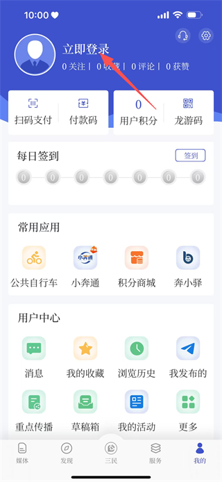 2、在个人页面,点击立即登录区域,进入账号登录页面。