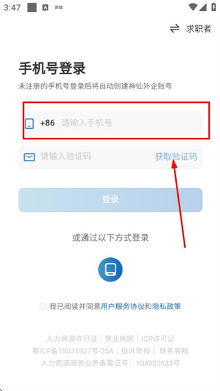 2、在登录页面填写手机号,勾选协议后,点击获取验证码。