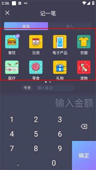 2、在记一笔页面选择目标支出分类,进入记账信息填写界面。