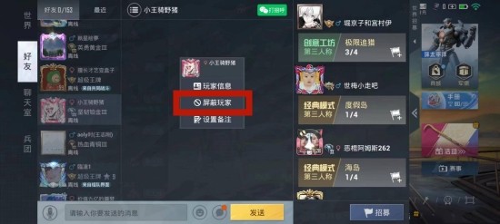 3、进去聊天界面之后,点击上边的三条横杠点击屏蔽玩家设置完成后即可不让别人看到你上线了。