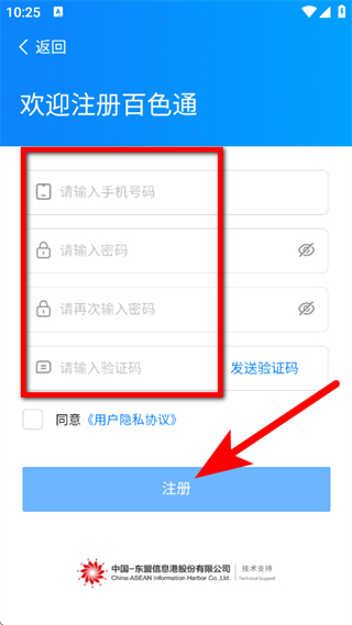 4、在注册页面,输入手机号、密码、确认密码、验证码,勾选协议后,点击注册,完成注册操作。
