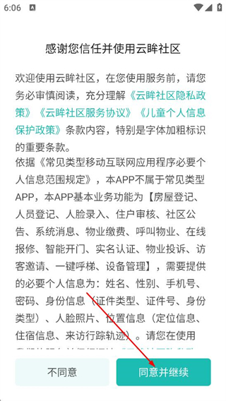 1、在云眸社区服务协议和隐私政策弹窗中,点击同意,进入首页。