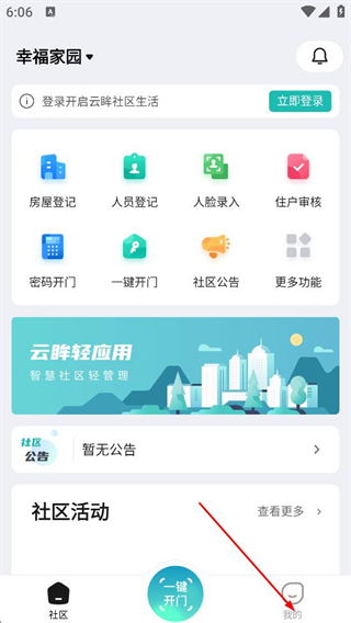 2、在社区首页,点击底部导航栏的我的,进入个人页面。