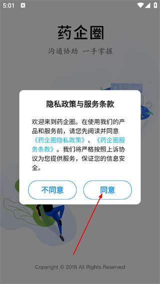 1、在药企圈的隐私政策与服务条款弹窗中,点击同意,进入应用。