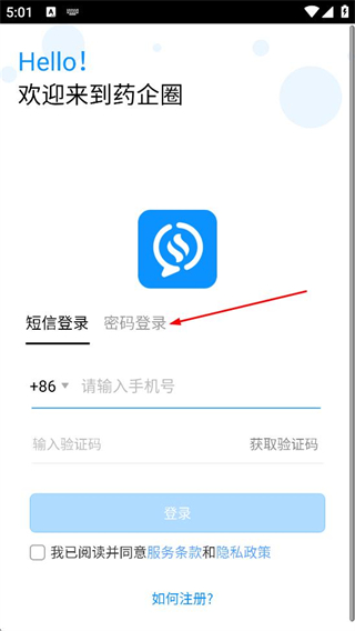 2、在药企圈的欢迎页面,点击密码登录选项,切换到密码登录页面。