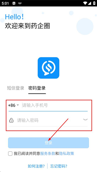 3、在密码登录页面,填写手机号与密码,点击登录,完成药企圈账号登录。