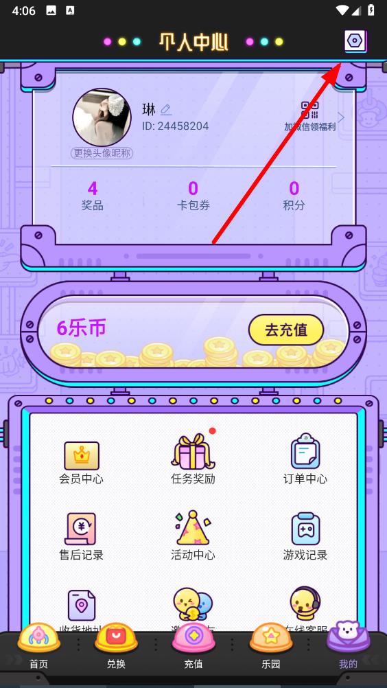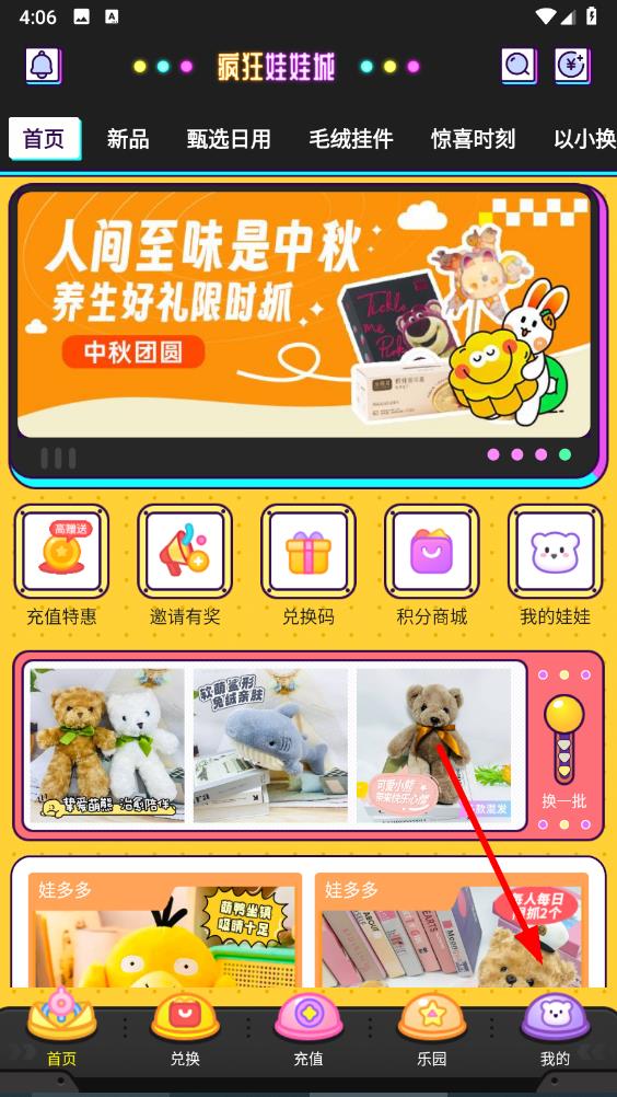 1、打开疯狂娃娃城app,进入主界面,点击底部导航栏最右侧的我的,进入个人中心。