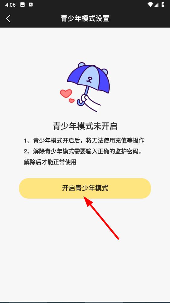 4、在青少年模式设置界面中,点击开启青少年模式按钮,按照提示设置监护密码,即可成功开启青少年模式。