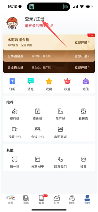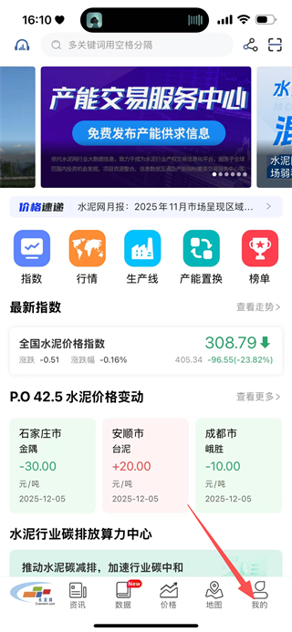 1、在水泥网首页,点击底部导航栏的我的,进入个人页面。