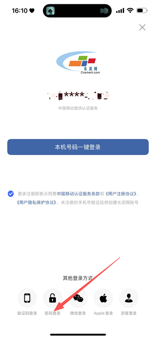4、在密码登录页面,填写手机号与密码,点击登录,完成水泥网账号登录。