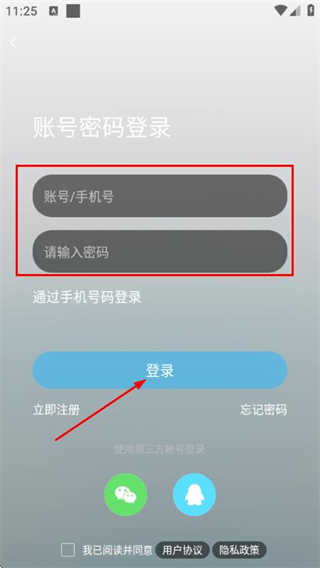 3、在登录页面填写手机号和密码,勾选协议后,点击登录完成账号登录操作。