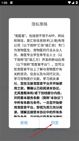 1、在宠医客的隐私策略弹窗中,点击同意,进入手机验证码登录页面。
