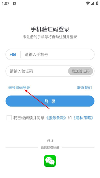 2、在手机验证码登录页面,点击账号密码登录选项,切换到账号密码登录页面。