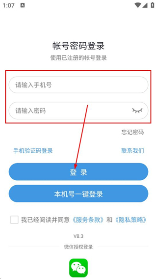 3、在账号密码登录页面,依次填写手机号与密码,点击登录,完成账号登录。