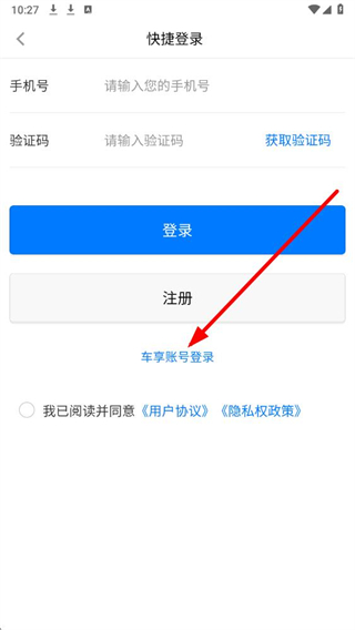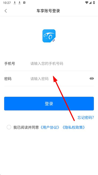 3、在车享账号登录界面,依次输入手机号与对应密码,勾选协议后,点击登录按钮,即可完成登录。