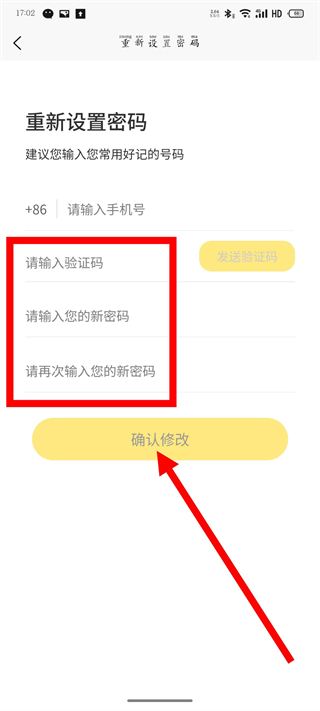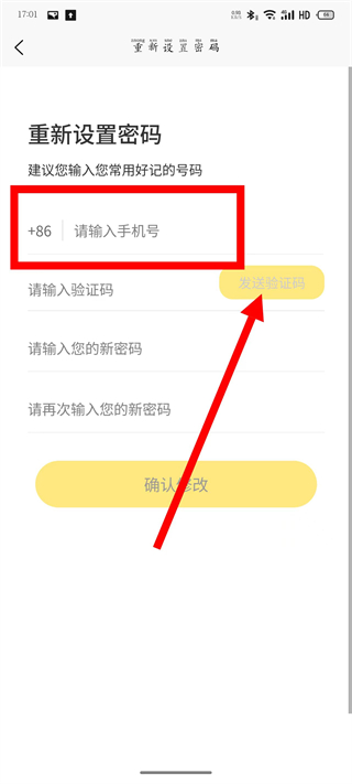 4、在重新设置密码页面,输入手机号,点击发送验证码。