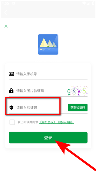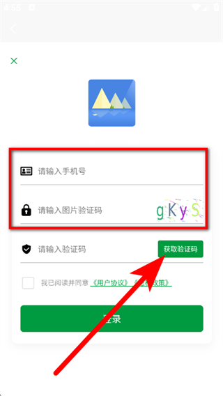 3、在登录页面,输入手机号、图片验证码,点击获取验证码。