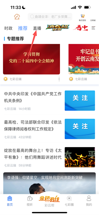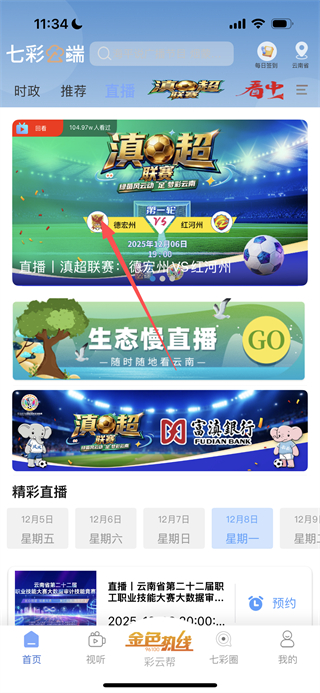 1、在七彩云端的首页,点击顶部的直播选项,进入直播页面。