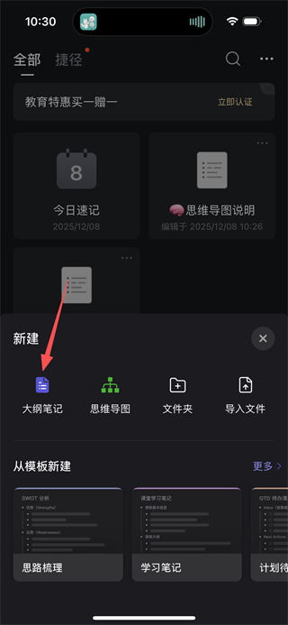 2、在新建菜单中,点击大纲笔记选项,进入大纲笔记编辑页面。