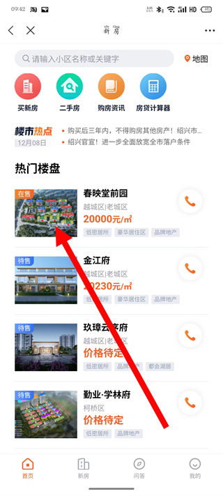 3、在热门楼盘列表,点击选择目标楼盘,点击进入该楼盘详情页。