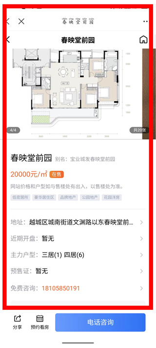 4、在详情页面,查看楼盘价格、户型、地址等信息,还能进行预约看房或电话咨询。