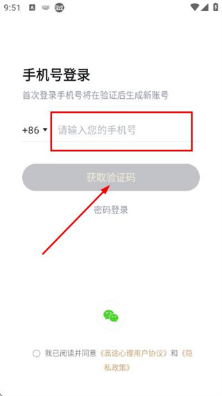 2、在手机号登录页面填写手机号,勾选协议后,点击获取验证码。
