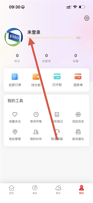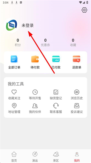 2、进入个人中心后,点击未登录区域,进入登录页面。