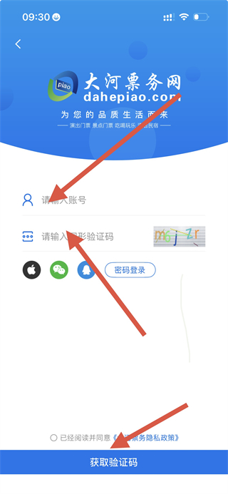 3、在注册登录界面,输入账号和验证码,勾选同意协议后点击获取验证码即可。