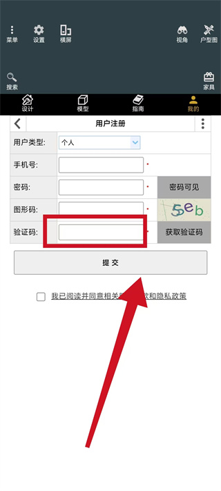 3、在用户注册页面,选择用户类型为“个人”,依次填写本人手机号、设置账号密码,输入右侧显示的图形码。