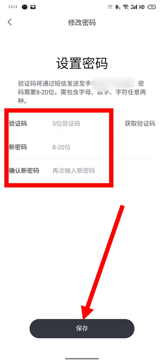 5、在修改密码页面,填写验证码,设置新密码,点击保存,完成密码修改。