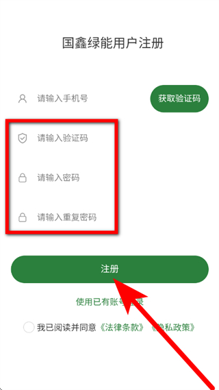 4、输入验证码、设置新密码,勾选协议后,点击注册,完成注册操作。